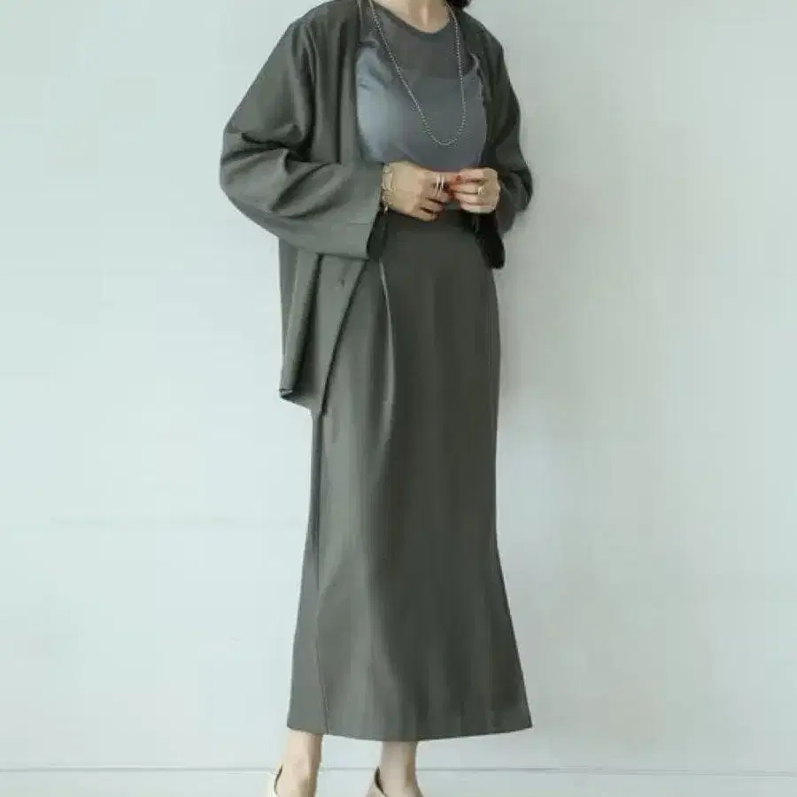 스커트는 내로우 실루엣으로 프론트 한쪽에 들어간 비대칭 슬릿이 포인트입니다.