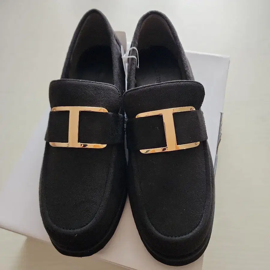 글로벌 워크 에어카루 통굽 로퍼 블랙 스웨이드 골드 금장 장식