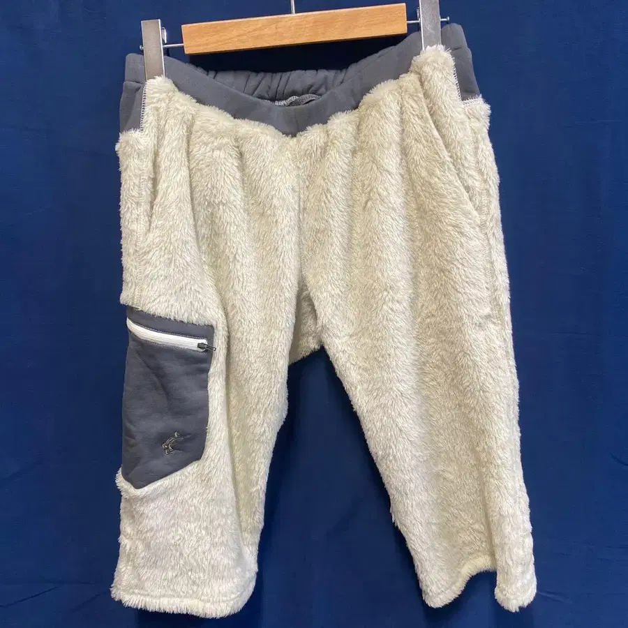 플리스 소재의 크림색 숏팬츠, 지퍼 포켓이 있어 기능성도 뛰어납니다.