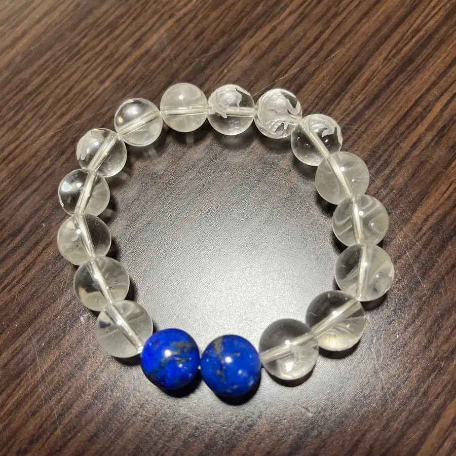 수정과 청금석 비즈를 사용한 캐주얼 팔찌입니다. - 소재: 수정과 청금석 - 디자인: 비즈 팔찌 - 색상: 투명과 파랑 - 스타일: 캐주얼 - 사이즈: 프리 사이즈 수정 하나하나에 조각이 새겨져 있습니다. 구매 금액 약 50,000엔. 방문해 주셔서 감사합니다.