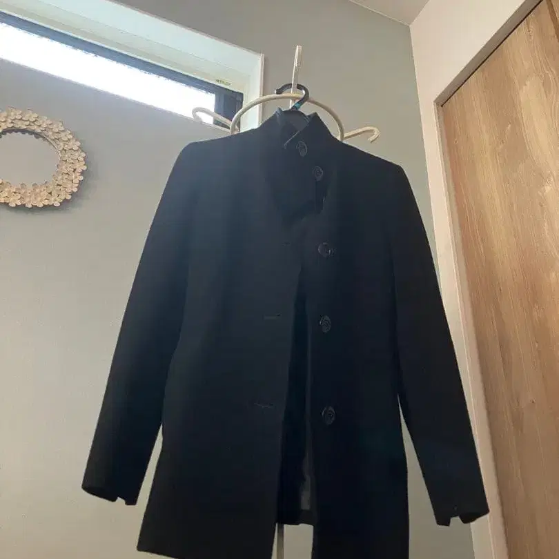 블랙 울 코트 허리 리본 포함