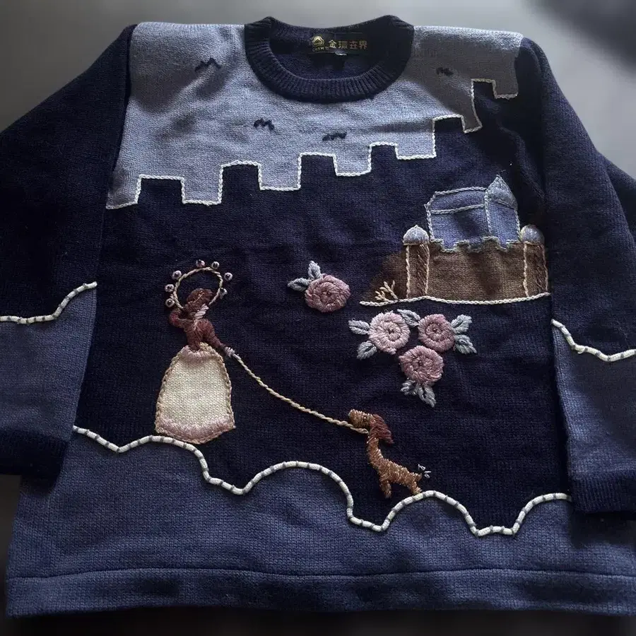 자수 디자인 니트 스웨터 긴팔 네이비