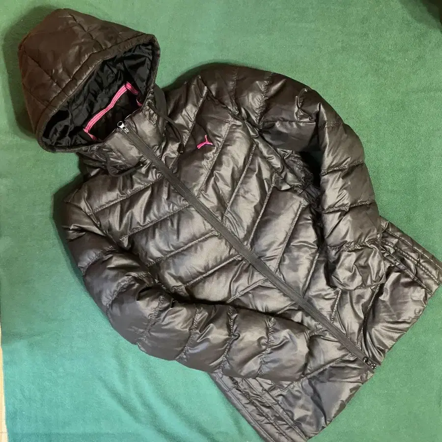 자동 번역되었어요. 원문보기후드 부착 블랙 다운 자켓, 핑크 악센트가 특징.