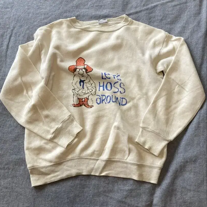 프론트 프린트가 빈티지 맨투맨다운 느낌으로, 보기 좋게 갈라져 있습니다. 연대에 비해 데미지는 적고, 전면부 왼쪽에 선이 있으며, 오른쪽 소매에 작은 구멍이 있습니다. 구제 의류에 익숙하신 분이라면 괜찮은 수준이라고 생각합니다.