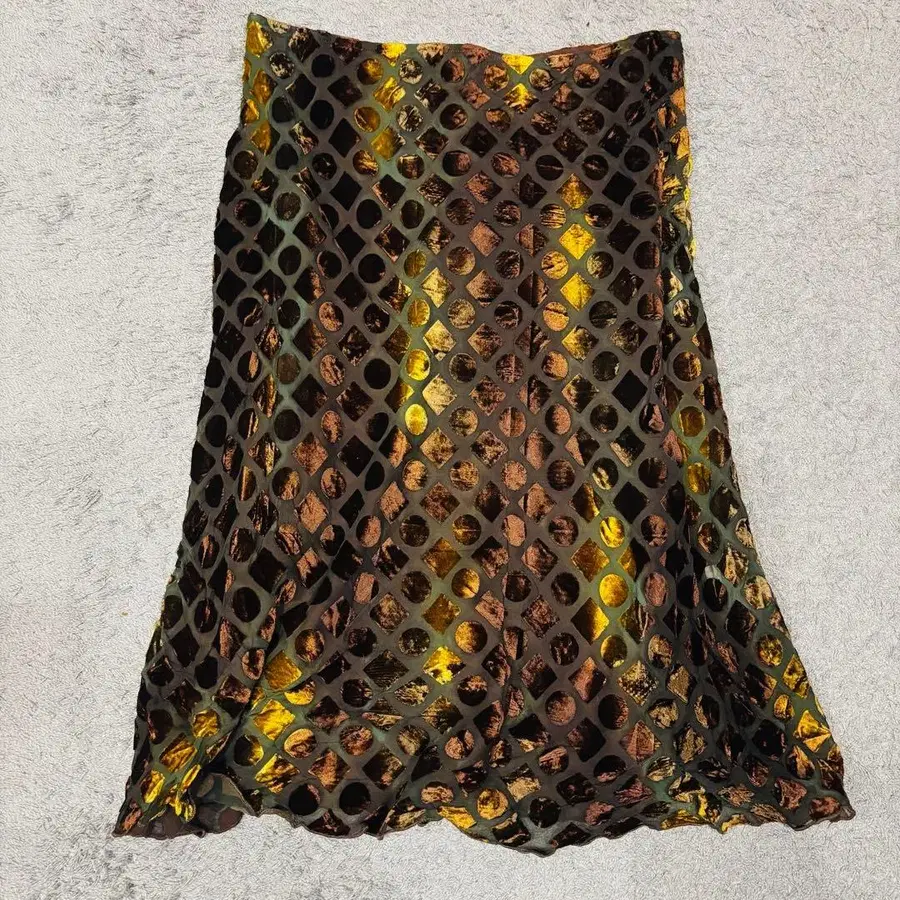 자동 번역되었어요. 원문보기브라운과 골드 도트 무늬의 플레어 스커트, L 사이즈, 쉬폰풍 원단으로 가벼운 인상.