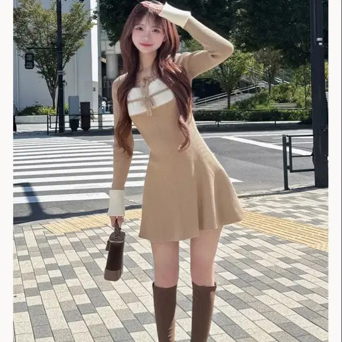 Darich 리본 퍼 플레어 니트 미니 원피스