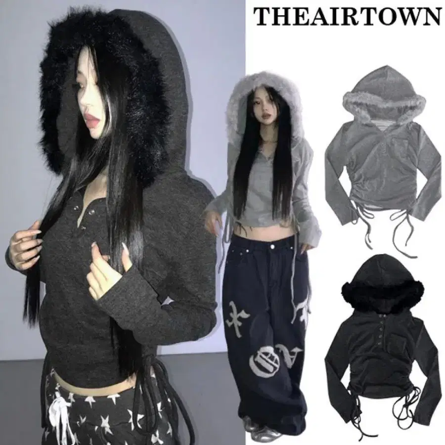 THE AIR TOWN 에코 퍼 후드 사이드 리본 V 라인 후드티