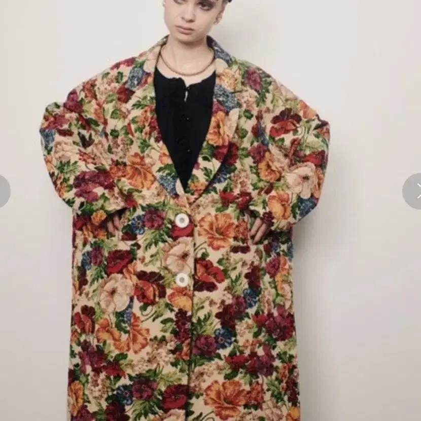 고급스러움이 느껴지는 고블랑 원단을 사용한 체스터 코트입니다. 탄탄한 원단감에도 불구하고 가벼운 착용감이 특징입니다. 다채로운 색상의 꽃무늬가 예술적이고 화려한 인상을 줍니다. 레트로한 분위기를 풍기는 빅 버튼도 포인트입니다. 약간 둥근 실루엣으로 친근함도 더했습니다. 오버 사이즈로 나와 두꺼운 니트 위에도 편안하게 착용 가능하며, 겨울까지 즐기실 수 있습니다.