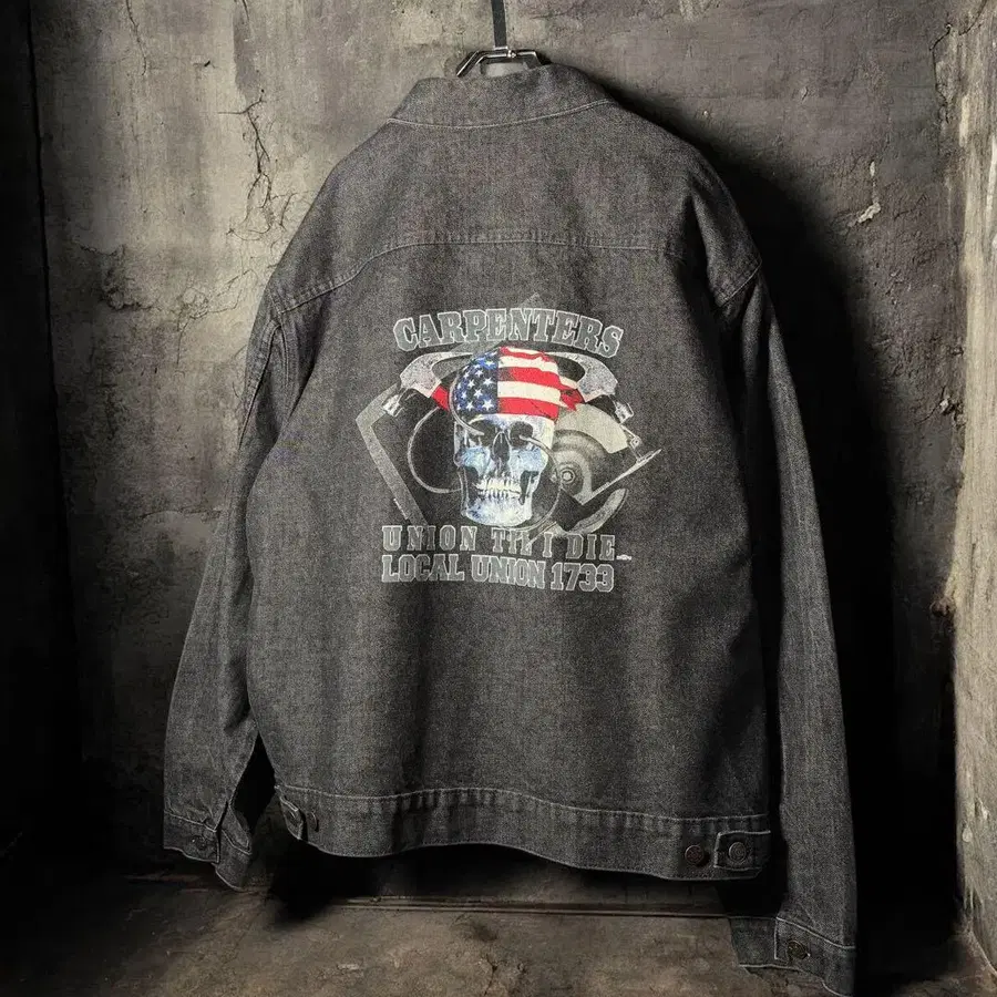 UNION LINE, 카펜터즈, 데님 자켓, 워크 자켓, USA제, 노동조합, 백 프린트, 스컬, 그레이 데님, 구제 의류, 빈티지, 스트릿