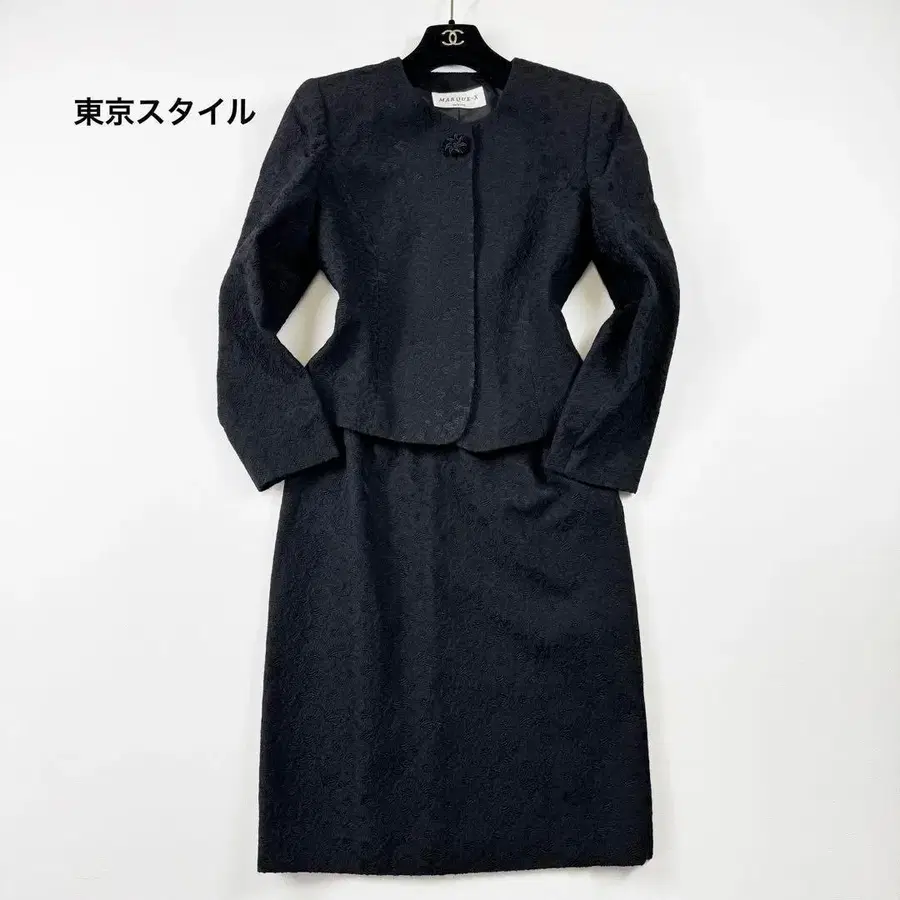엘레강트한 블랙 투피스 세트. 노카라 자켓의 버튼에는 꽃무늬 가공이 되어 있으며, 무릎 기장의 펜슬 스커트와 같은 소재로 통일감을 줍니다. 특별한 날이나 포멀한 장면에 어울리는 시대를 초월한 클래식한 디자인입니다.