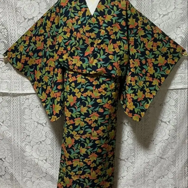 [거의 미사용] 울 기모노 꽃무늬 울 일부 교육용 실 부착