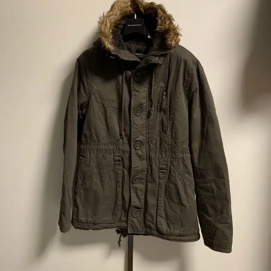 카키(올리브 그린)의 차분한 컬러로, 캐주얼부터 포멀한 스타일까지 폭넓게 활용할 수 있는 아이템입니다. 후드 부분에는 퍼가 달려 있어 방한성도 뛰어납니다. 허리는 드로 코드(조임끈)로 조절 가능하여 실루엣을 바꿔가며 착용할 수 있습니다.