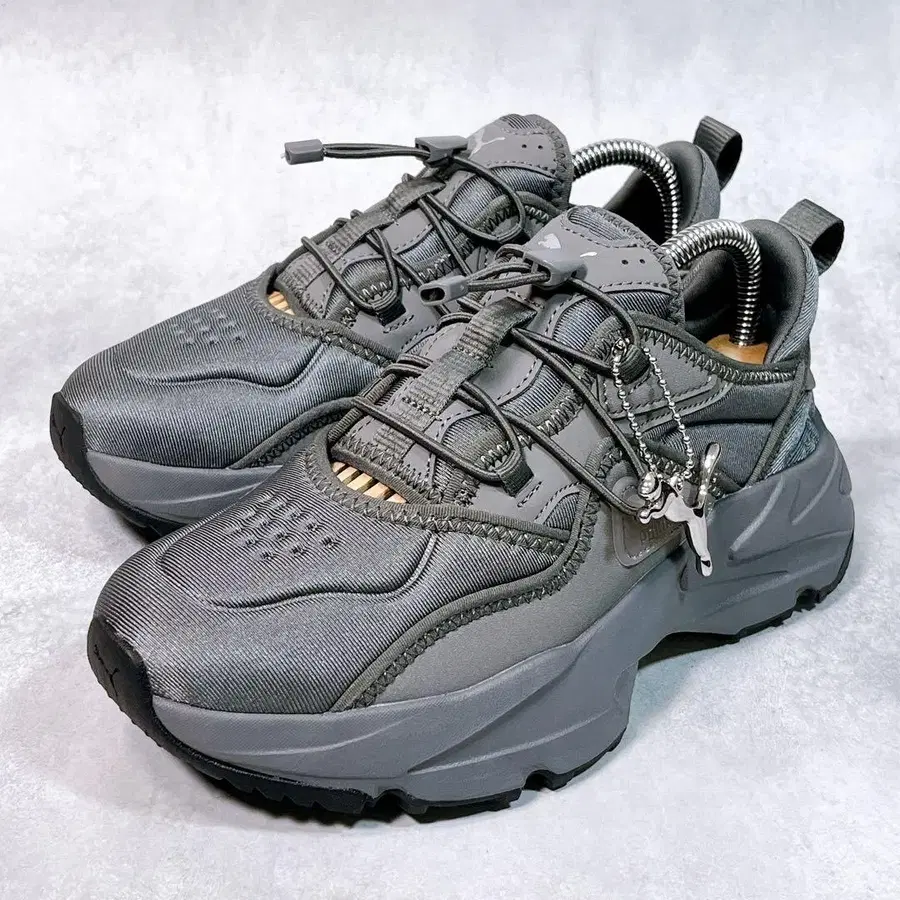 에미 한정 디자인으로, 두 종류의 그레이와 광택감이 나는 나일론 소재를 채용했습니다. 핏감을 조절할 수 있는 드로 코드 타입의 슈레이스에는 푸마 캣 참을 달아 반짝이는 악센트를 더했습니다.