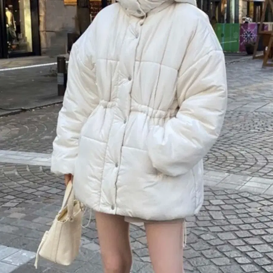 화이트 후드 부착 다운 자켓