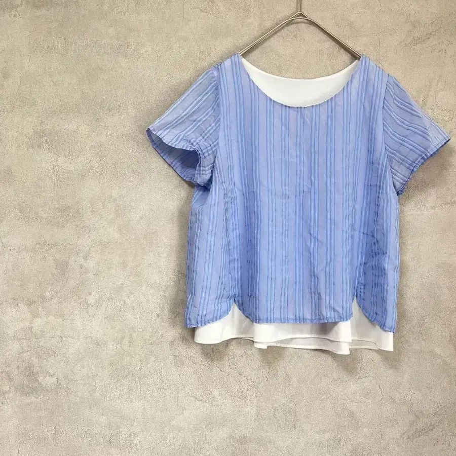 MF 에디토리얼 파랑 화이트 스트라이프 시스루 반팔 셔츠 레이어드 스타일