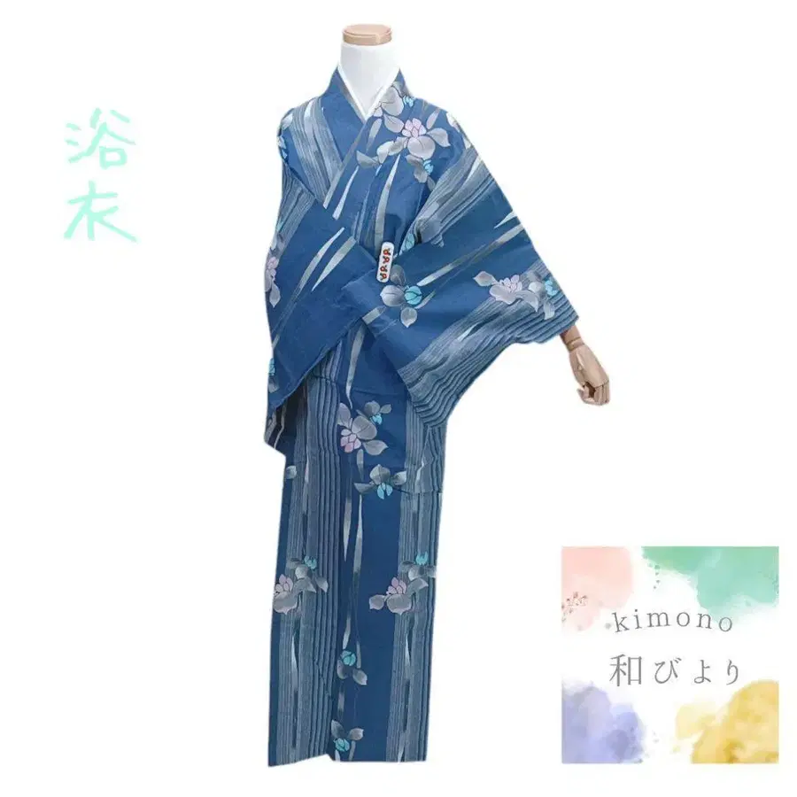W34 기모노 면 유카타 축제 파랑 꽃무늬
