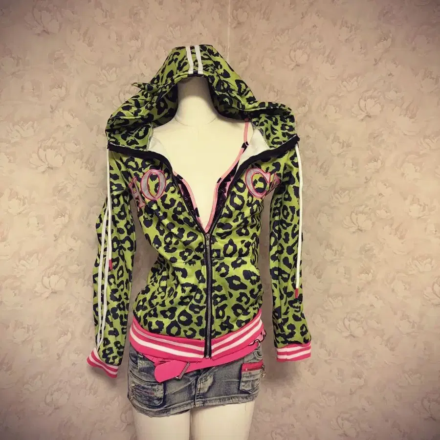 헤이세이 갸루 00s 그린 레오파드 무늬 후드 부착 후드티 Y2K