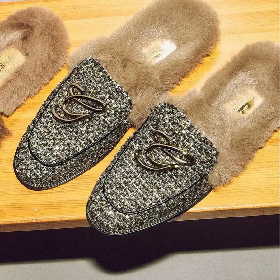 퍼 달린 트위드 슬리퍼 샌들 골드