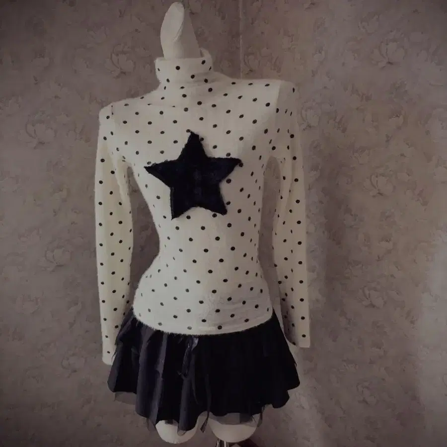 헤이세이 갸루 도트 무늬 별 모양 자수 터틀넥 상의 히메 스타일 Y2K