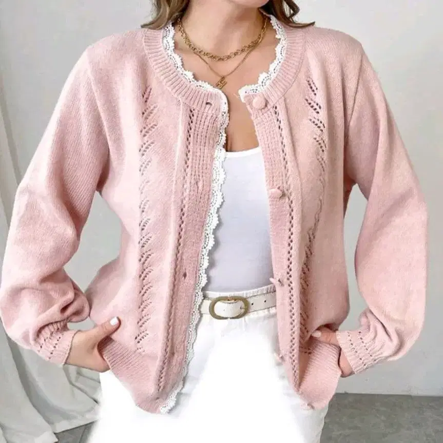 가디건 레이스 장식 핑크 가디건 오버사이즈 편안한 부해 보이지 않는