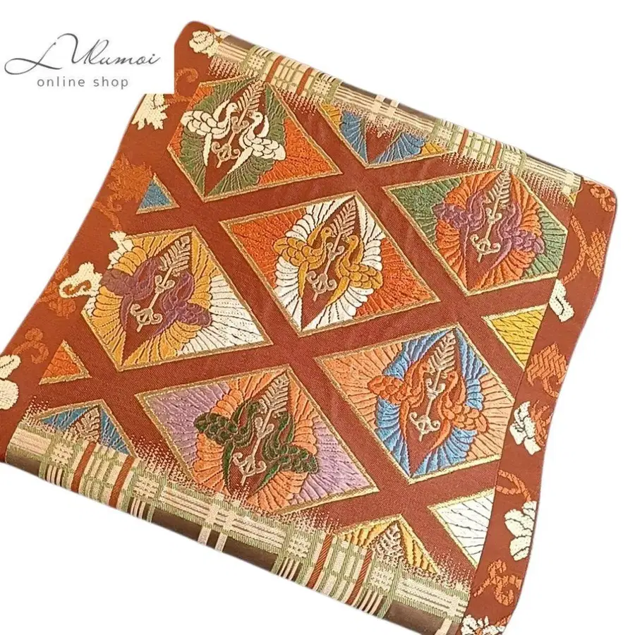 LULU13 후쿠로 오비 마주보는 학 격자 무늬 꽃 오타이코 무늬 브라운