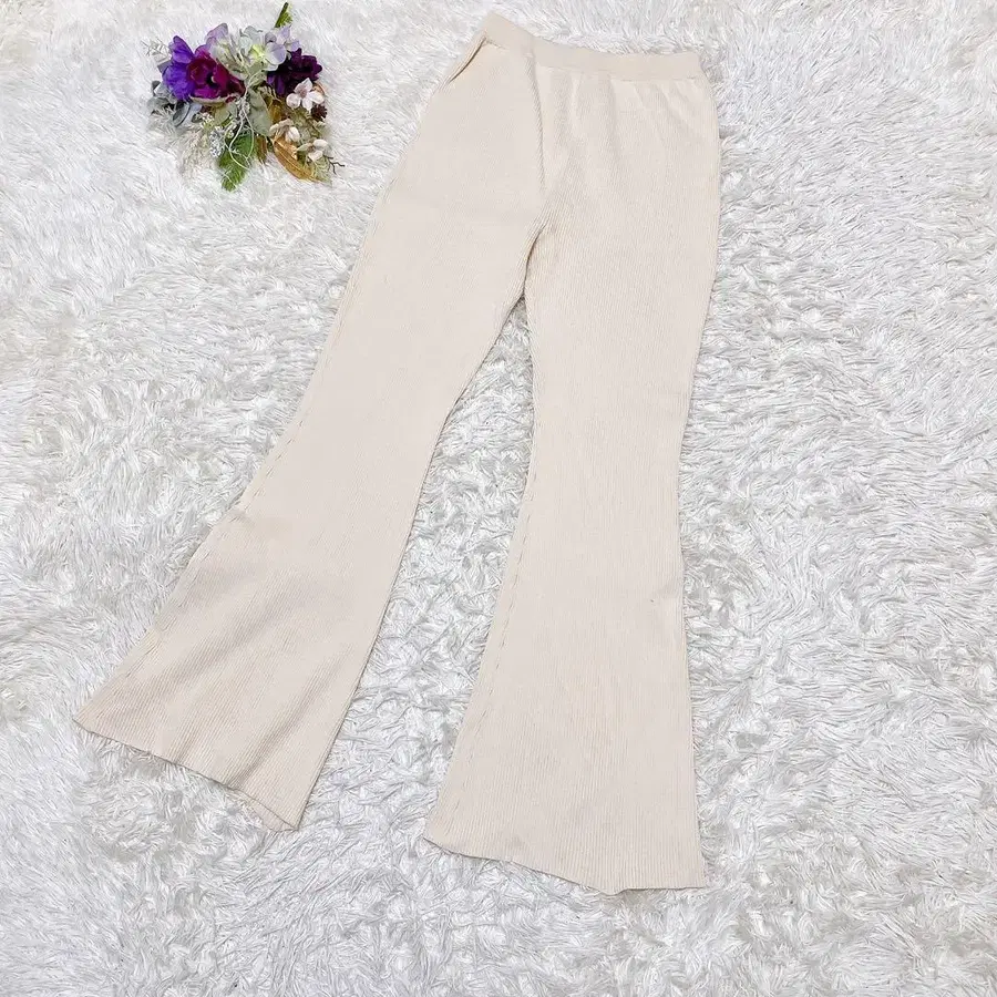 리브 편직의 베이지 플레어 팬츠, 스타일리시하고 쾌적한 착용감.