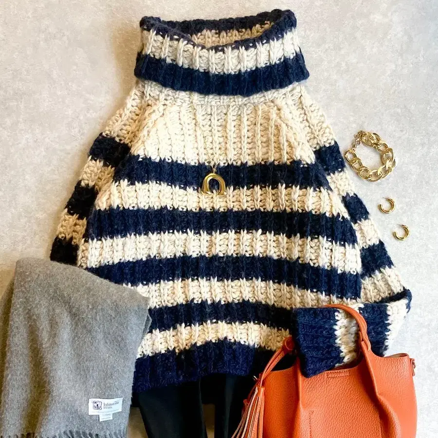 큼직하게 짜인 캐주얼함에, 어른스러운 네이비 x 베이지 배색이 늠름한 품격을 풍기는