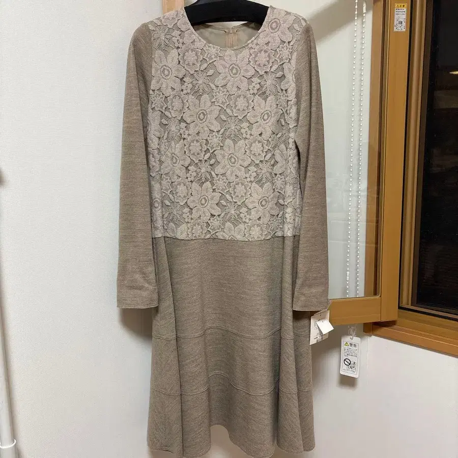 (주) 월드 베이지 레이스 절개 긴팔 원피스