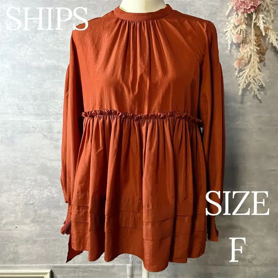 가슴 밑 절개 부분에는 작은 프릴을 달아, 거기서부터 부드럽게 퍼지는 개더가 부드러운 실루엣을 연출합니다.