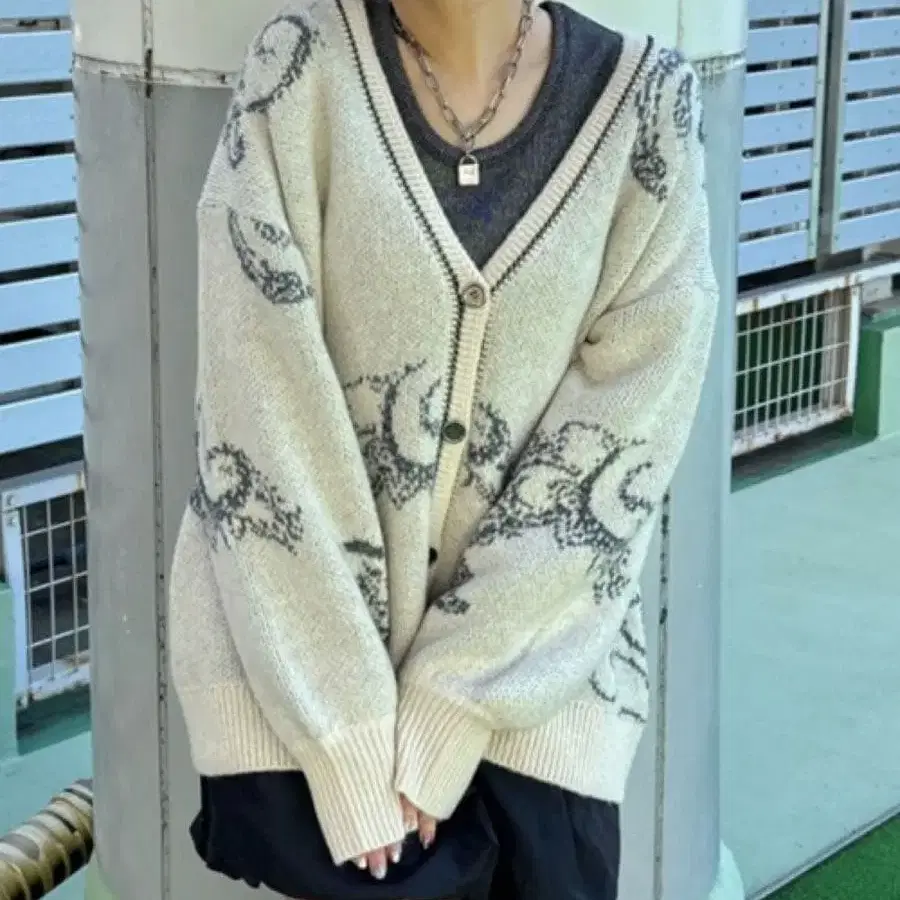 JEANASIS 페이즐리 라메 기모 V넥 가디건 화이트