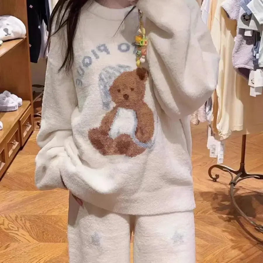부드러운 벨벳 (하프 파일) 소재로 촉감이 뛰어난 파자마 세트. 화이트 베이스에 귀여운 곰 자수 패턴이 악센트를 더하며, 상의+팬츠 셋업 디자인입니다. 보온성이 뛰어나 집에서의 릴랙스 타임이나 수면 시 최적입니다.