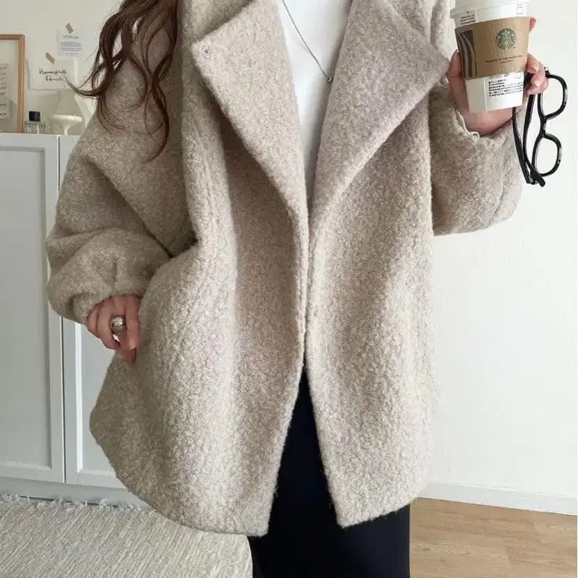 넉넉한 코쿤 실루엣으로 살짝 걸리시하게 연출. 노카라 코쿤 보아 코트