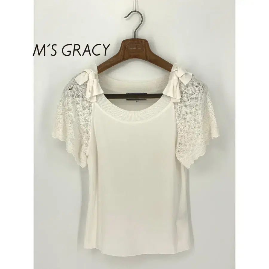 B0089/컨디션 최상 M'S GRACY 엠즈 그레이시 코튼 리본 포함 레이스 반팔 니트 티셔츠 스웨터 40 L 화이트 여성용