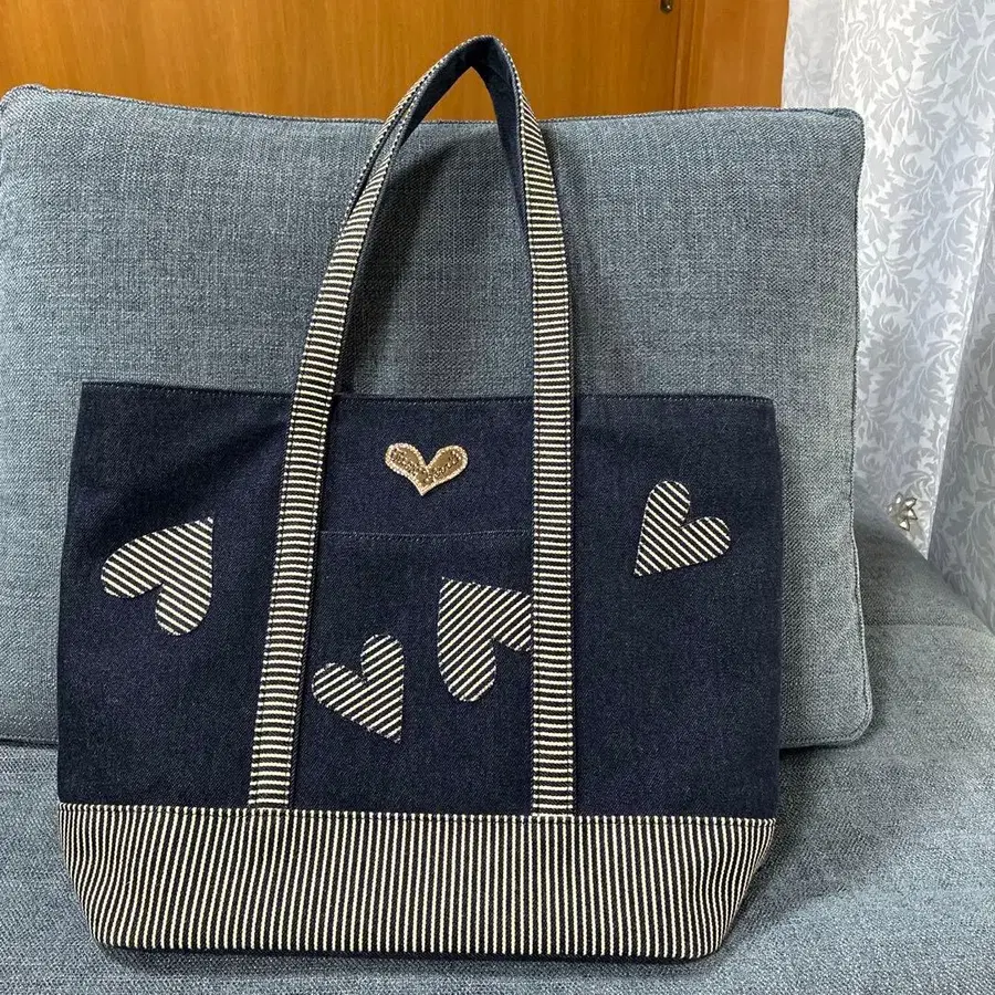 네이비 화이트 스트라이프 원단이 악센트인 토트백은 수납력이 뛰어나 스테디셀러로 추천합니다.