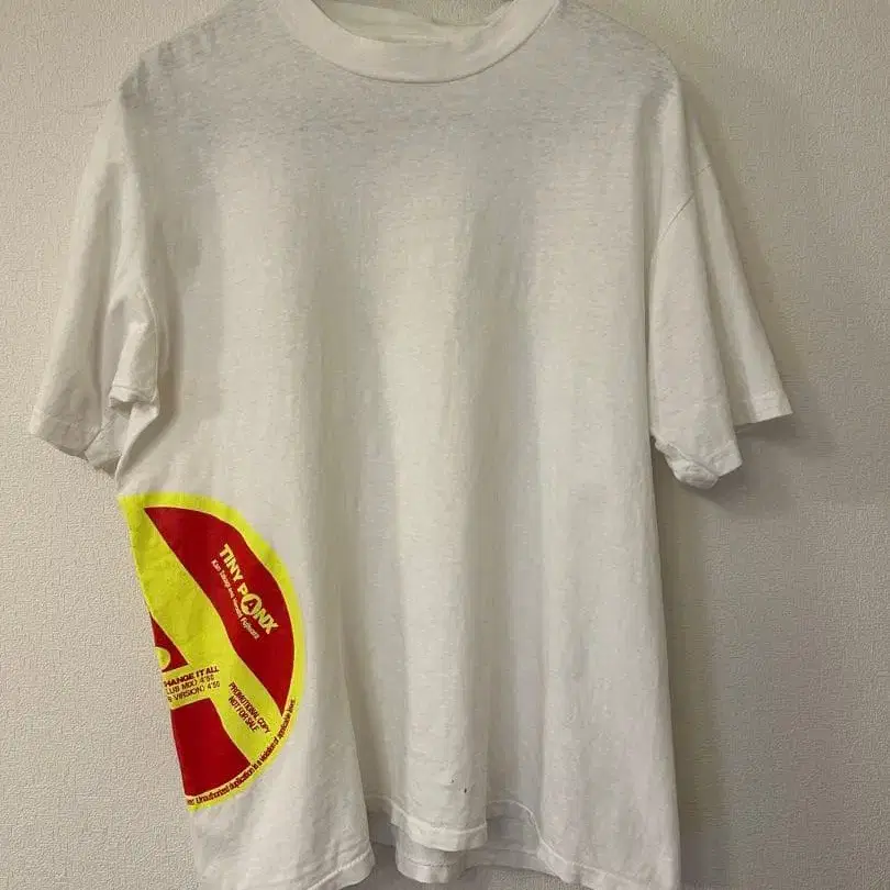 TINY PANX last orgy tee LAST ORGY의 라벨 디자인을 모방한 티셔츠는 여러 종류가 존재하는 것으로 보이지만, 이 라운드 바디에 측면에 프린트된 것은 좀처럼 보기 힘듭니다. 이 센스는 역시 대단하다고밖에 말할 수 없습니다. 당시 nowhere 매장에서 구매한 것으로, 본가 옷장에 보관되어 있었습니다. 30년 이상이 경과하여, 노후화에 따른 희미한 오염 등은 있지만, 구멍, 찢김 등은 없습니다. 집에서 클리닝 완료했지만 완전히 지워지지 않은 얼룩이 있습니다. 바디는 90s ONEITA의 USA 제조로 빈티지 특유의 분위기가 있습니다. 사이즈는 L이며 가슴 너비 54.5, 기장 66입니다. last orgy 2 후지와라 히로시 팬분들, 당시 제품에こだわり 있는 분, 컬렉터분들께 추천합니다. 바꿔치기 방지를 위해 반품은 불가합니다. - 색상: 화이트 - 디자인: 그래픽 프린트 방문해 주셔서 감사합니다.