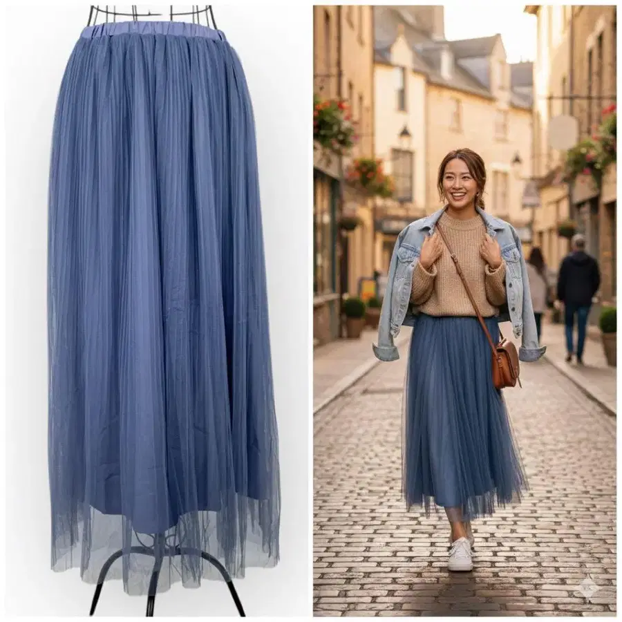 블루 색상의 튤 소재가 고급스러운 롱 기장 스커트입니다. 허리는 밴딩 사양으로 착용감이 좋으며, 풍성한 실루엣이 여성스러운 인상을 주는 아이템입니다. ✨