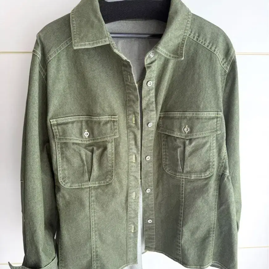 자동 번역되었어요. 원문보기올리브 그린 디자인으로, 앞면에 포켓이 달린 스트레치 데님 자켓입니다.