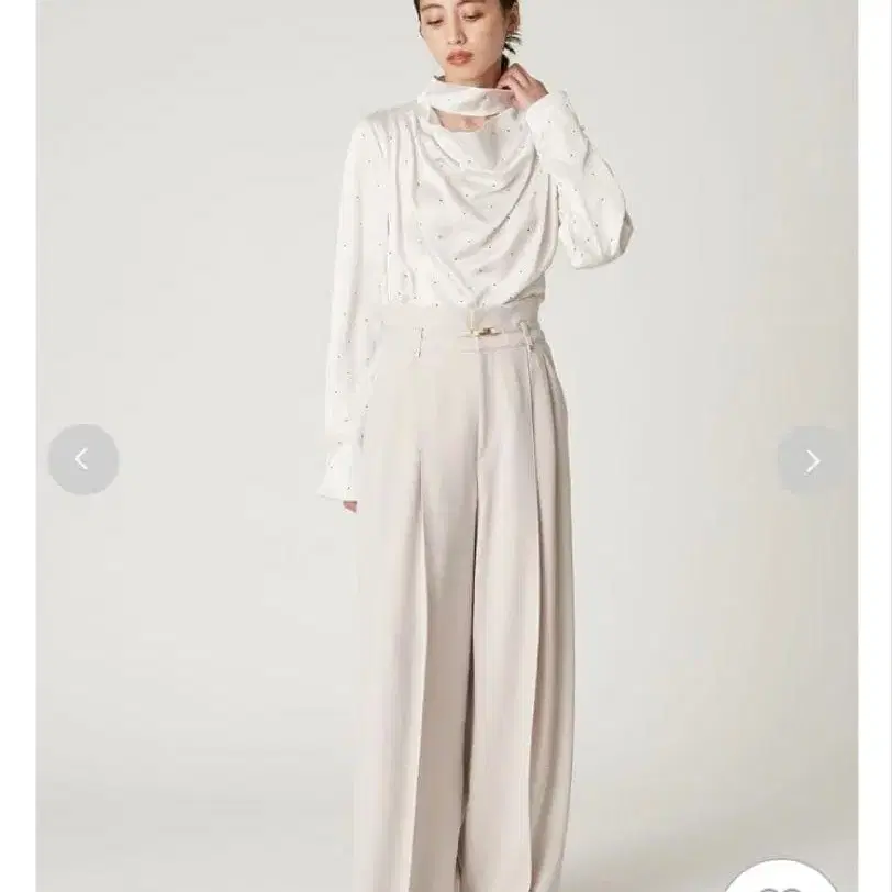 중심을 업시키는 하이웨스트에는, 골드 컬러의 섬세한 버클이 고급스러운 동일 원단 벨트를 세트.