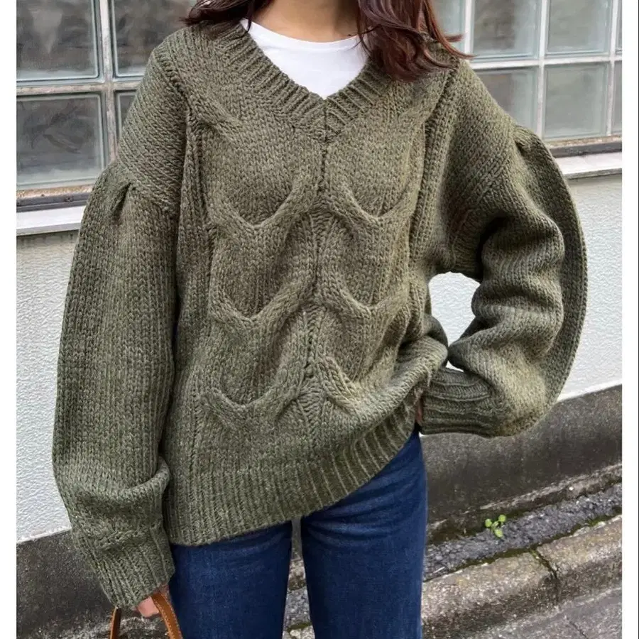 Lui's 올리브 그린 케이블 짜임 스웨터
