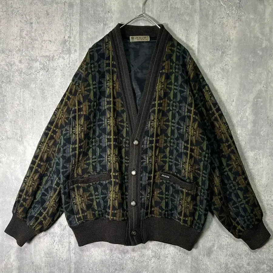 기하학 올 패턴 가디건 그린 브라운 일본제 빈티지