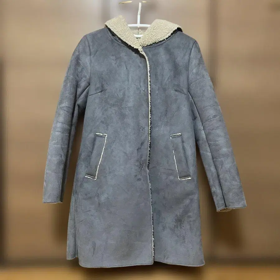 그레이 스웨이드풍 롱 코트 후드 부착 보아 코트