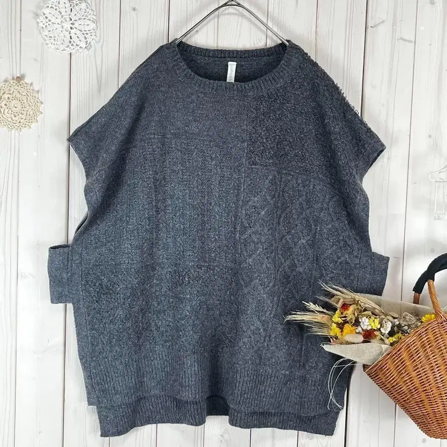 새상품 니트 베스트 패치워크 차콜 프리