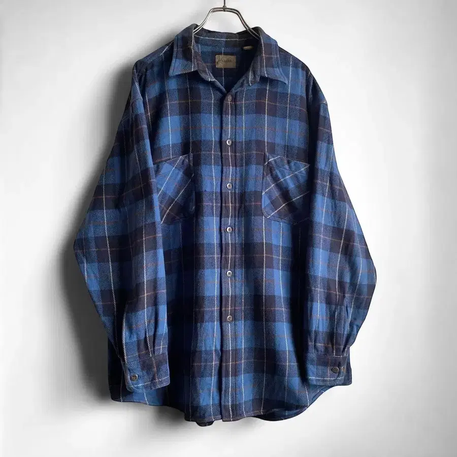 두께감 있고 쫄깃한 코튼 플란넬 소재에, 바랜 네이비 x 블루 베이스의 절묘한 배색 체크 무늬, 넉넉하고 둥근 실루엣이 매우 멋진 아이템입니다.