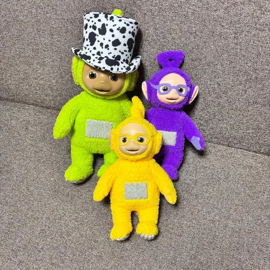 텔레토비즈 봉제 인형 라라 노랑 안경 봉제 인형 팅키윙키 보라색 안경 봉제 인형 딥시 그린 가장 좋아하는 모자 얼굴에 희미한 흠집? 있음 3종류 미사용 새상품, 택 포함 낱개 판매 불가 좋아하는 분께 양도합니다.