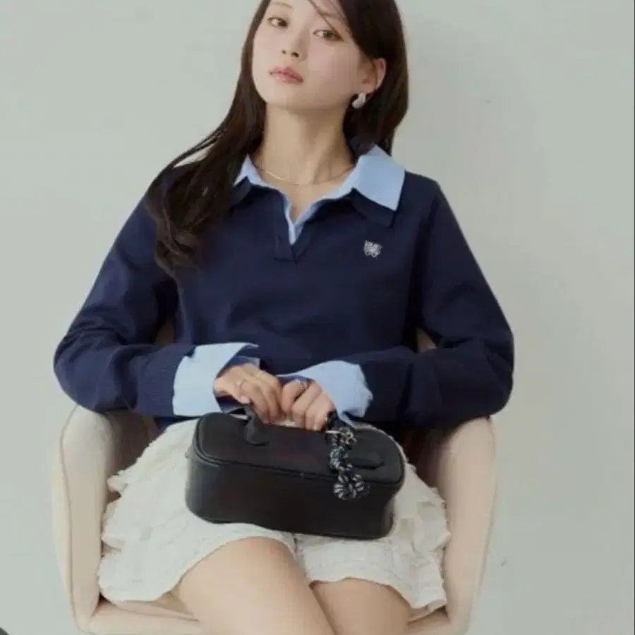 chico 자수 장식 카라 부착 폴로 니트 네이비