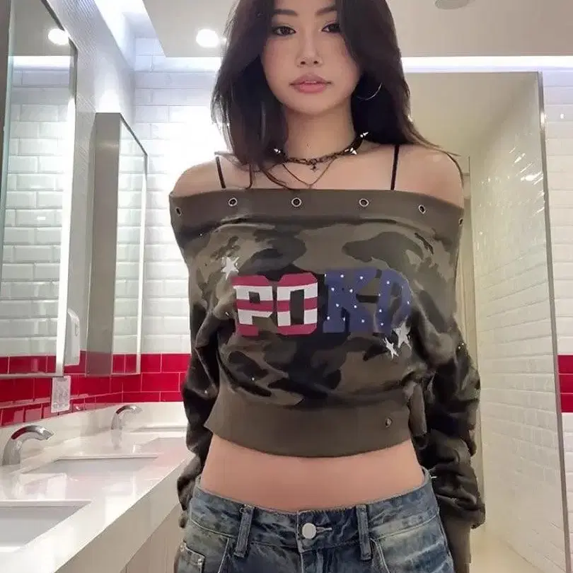 헤이세이 갸루 Y2K 카모플라쥬 오프숄더 크롭 상의 ksg