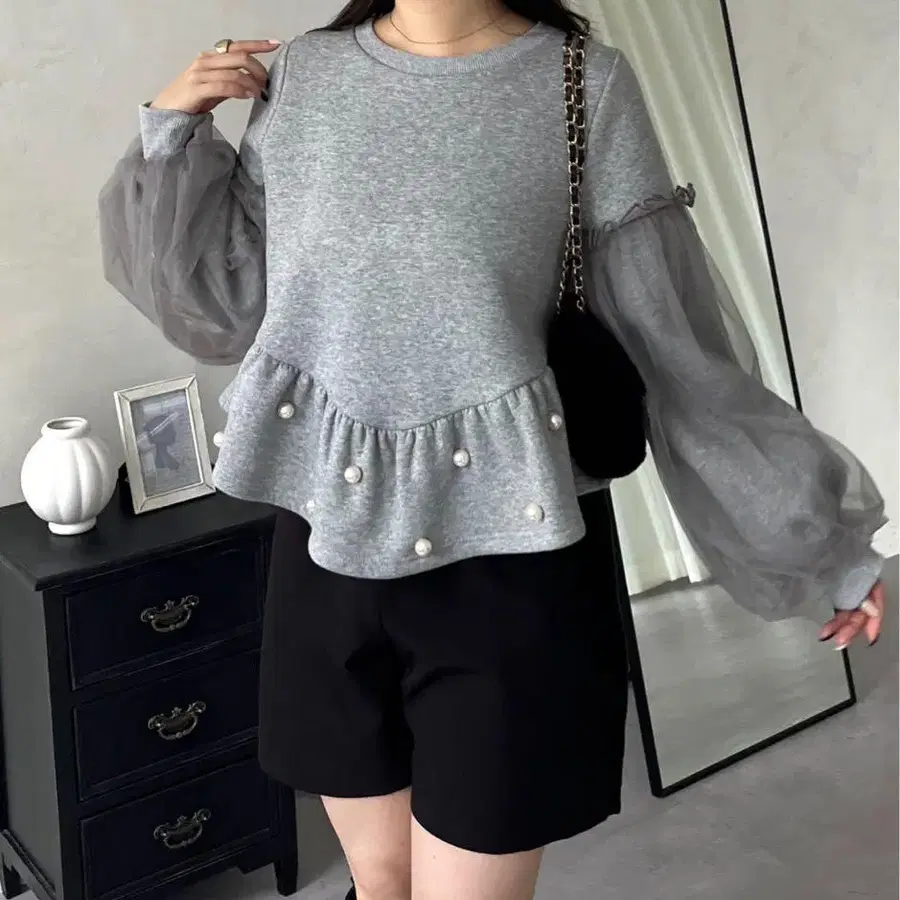 신상 프로즈 베일 소매 튤 펄 페플럼 맨투맨