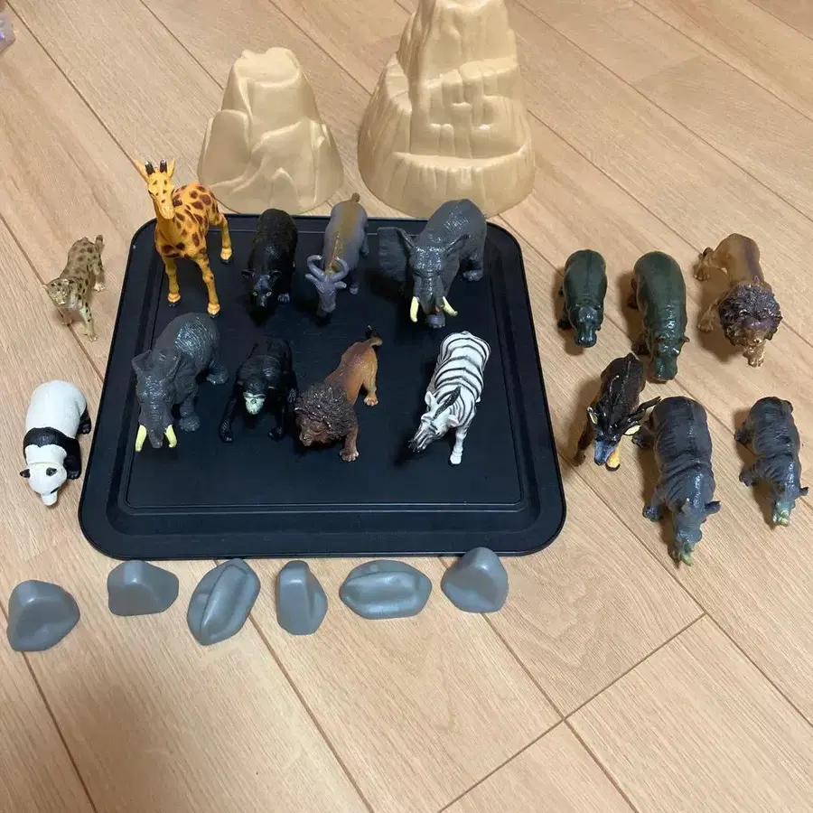 동물 피규어 16개 세트와 바위 오브제