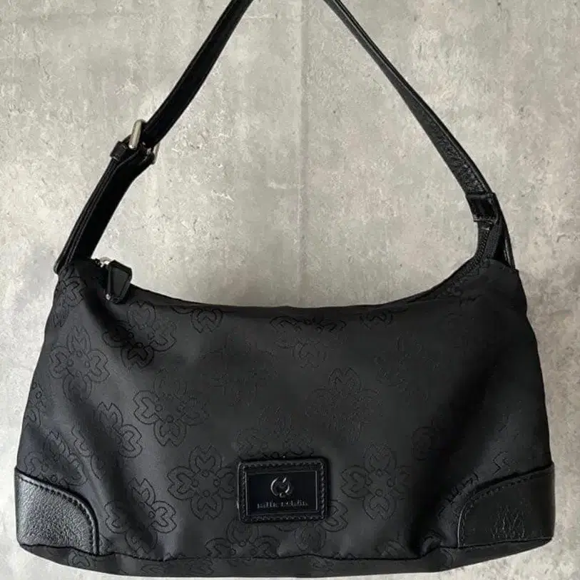 벚꽃 무늬가 장식된 올 블랙 숄더백. 고급스럽고 시크한 디자인으로, 소재는 나일론에 스트랩과 바닥 부분, 브랜드 태그에는 가죽을 사용하여 고급스러운 느낌을 주는 제품입니다.
