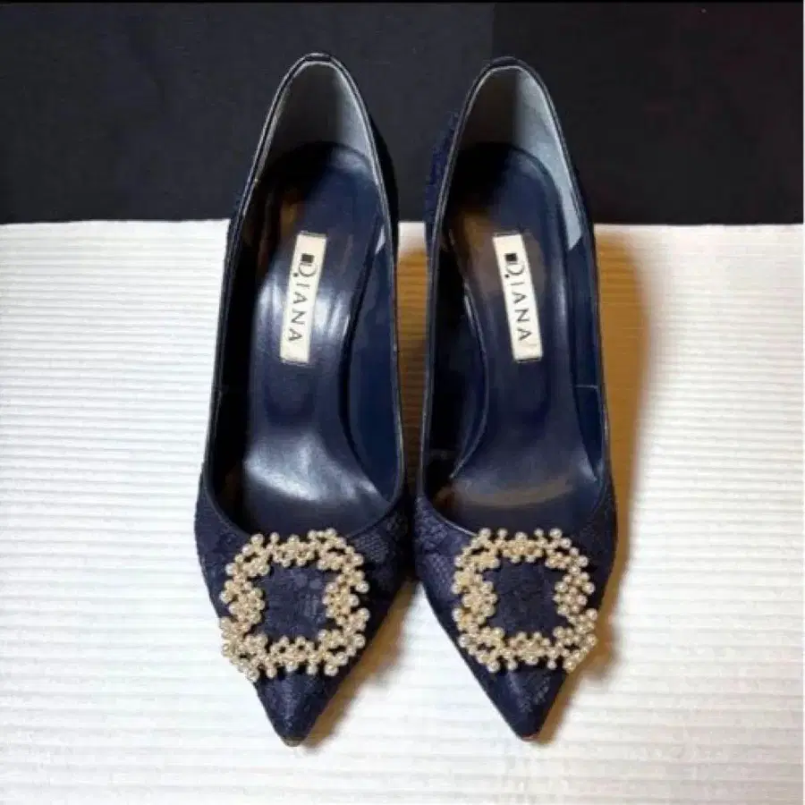 반짝이는 비쥬가 매우 눈길을 끄는 레이스 소재의 하이힐입니다.